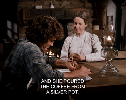 Then we cut to Caroline sharing how Mrs. Oleson had her over for fancy tea. Even though they had coffee together the same morning? I suppose it’s possible.