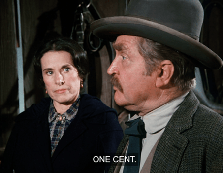 Annoyed, Woods skips to the biggest lot: the farm itself. When Doc bids a penny, Mrs. Oleson herself shouts “four hundred dollars!” ($12,000). But Woods reminds her as the lienholder, she herself is not allowed to buy anything, since she’s the one selling.