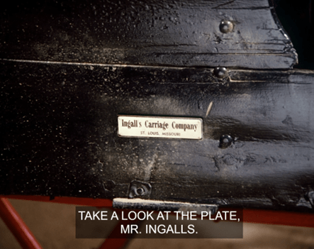 When Caroline asks what the estate consists of, Whitehead brings them outside and shows them a name plate on his buggy, which he notes he rented right here in Walnut Grove. It reads Ingalls Carriage Company.