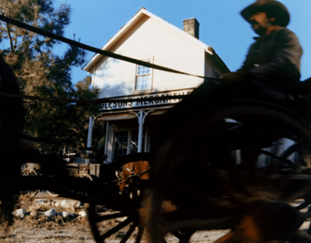After a break, somber music conveys us to the Mercantile, where Mustache Man is driving by, very close to the camera, in fact.