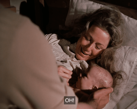 The spell broken at last, Ma stares adoringly at the baby and says she feels wonderful.