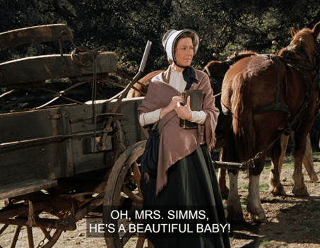 Mrs. Simms is hosting Caroline for tea and talking about how she never expected to get pregnant at her age. (This episode actually aired on Charlotte Stewart’s thirty-seventh birthday!)