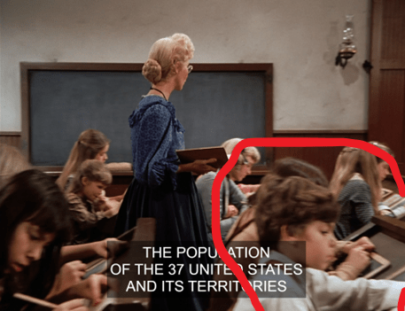 The Bead is telling the kids how the U.S. population in 1870 was over 38 million, “not including the Indians.” (Of course.)