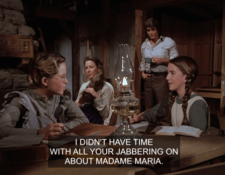 Oh, I forgot, I said I was going to work backwards to date this story. Well, since Ma explicitly tells us we’re in 1880 at the end, we’ll go with that. Assuming the Bead’s pregnancy was only about a month ahead of Caroline’s (instead of three or four as I originally thought), we could date the early part of this story to April (an unusual time of year for birds to lay eggs, but whatever). If there was a gap of five months between Ma learning she’s pregnant and Laura meeting Madam Maria, that would mean the little Beadling was born in September and Baby Grace in October.