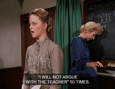 That night in the Little House common room, Carrie’s fucking around with Laura’s papers and gets screamed at. But Pa just chuckles and tousles her hair.