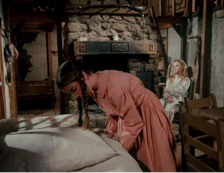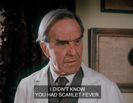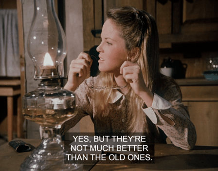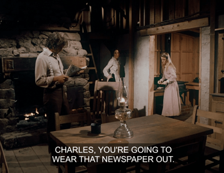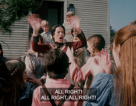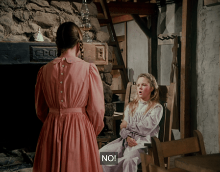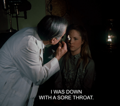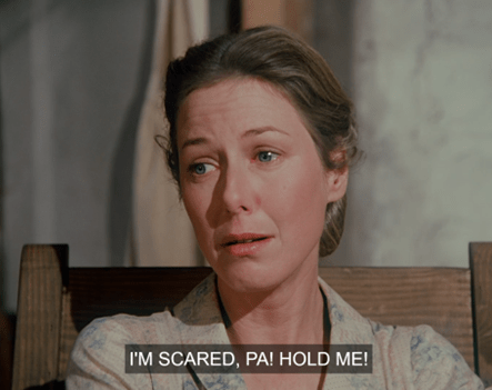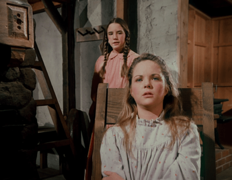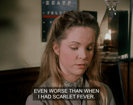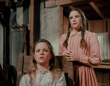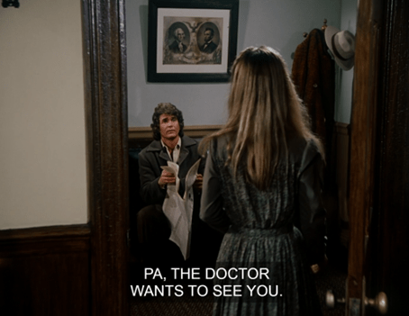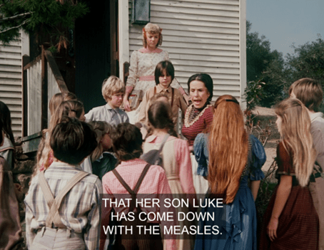 Suddenly, Mrs. Oleson appears out of nowhere, crying out there’s no school for two weeks because Luke Simms has brought measles from Springfield, where there’s an epidemic.