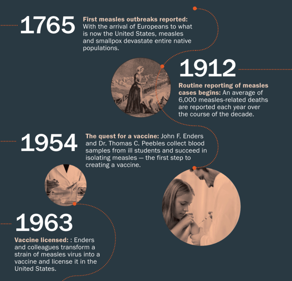 Measles was essentially eradicated after a vaccine for it was developed in the early 1960s. There have been occasional outbreaks since, including several this year, mainly because of anti-vaxxers – a population unfortunately on the rise, in this country at any rate.