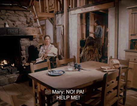 Suddenly from the loft, Mary screams, “No, Pa! Help me! Come help me, Pa! Help me!”