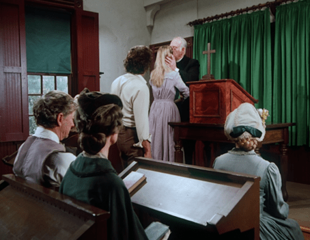 Charles leads her up to the front, where the Rev kisses her on the forehead.