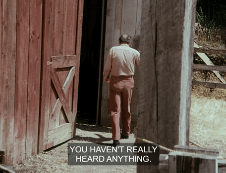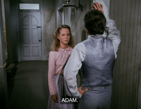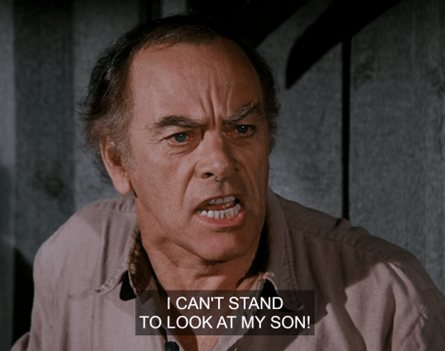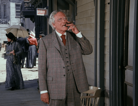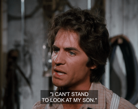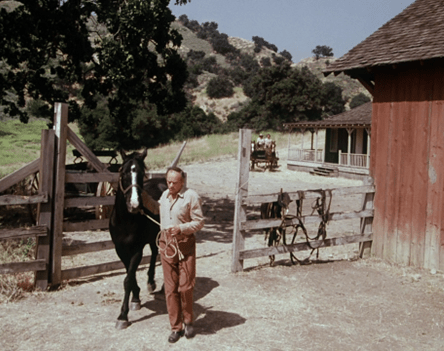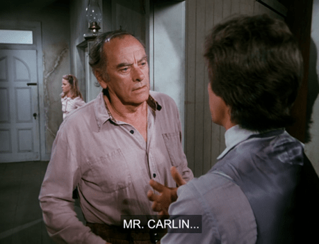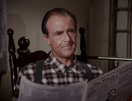 The elder man is familiar-looking, because he’s John Ireland, whom we previously met as Wendell Loudy, Mr. Hanson’s archenemy who stole his girlfriend and then burned her to death. (Little House!)
