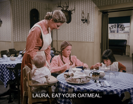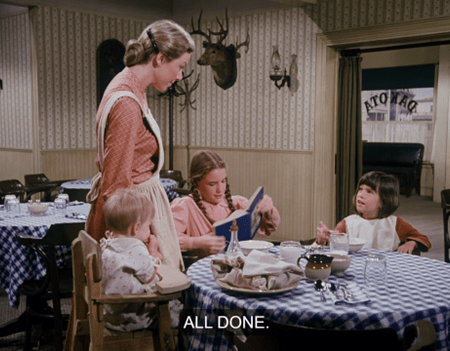 “All done!” slurps Carrie, who’s wearing a bib, which Ma takes off for her. (Anyone else find this odd? The Greenbush twins were eight years old by this time.)