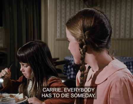 And for anybody who wants the full catalog of movies with multiple Little House cast members in them, I’m sure I’ve missed some, but a partial list would contain A Nightmare on Elm Street 5: The Dream Child, A Star is Born (1954), Airplane!, Airport ’77, Alice Doesn’t Live Here Anymore, An Officer and a Gentleman, John Carpenter’s Assault on Precinct 13, Blazing Saddles, Breakfast at Tiffany’s, Chinatown, Cimarron, Cool Hand Luke, Deadly Friend, Easy Rider, Escape From the Planet of the Apes, Escape to Witch Mountain, Flower Drum Song, Freaky Friday (1976), Grease, Gremlins, Gunfight at the O.K. Corral, Halloween II, Halloween 4: The Return of Michael Myers, Halloween 5: The Revenge of Michael Myers, High Anxiety, Hush . . . Hush, Sweet Charlotte, I Was a Teenage Werewolf, In Cold Blood, Jack Frost (1997), Jaws 2, Lost Highway, Love at First Bite, M*A*S*H, Midnight Madness, Mommie Dearest, Night of the Demons 2, Night of the Lepus, North by Northwest, Orca, Papillon, Parts: The Clonus Horror, Pee-Wee’s Big Adventure, Planet of the Apes (1968), Prophecy, Psycho, Rebel Without a Cause, Rosemary’s Baby, Sarah T.: Portrait of a Teenage Alcoholic, Scream Blacula Scream, Some Like It Hot, Spartacus, Star Trek III: The Search for Spock, Star Trek VI: The Undiscovered Country, The Birds, The Goodbye Girl, The Goonies, The Green Mile, The Music Man, The Pom Pom Girls, The Poseidon Adventure, The Swarm, The World’s Greatest Athlete, Three Days of the Condor, Torn Curtain, and WarGames. It’s a little classier than my Criterion graphic would suggest; and that’s just from the episodes we’ve done so far, of course.