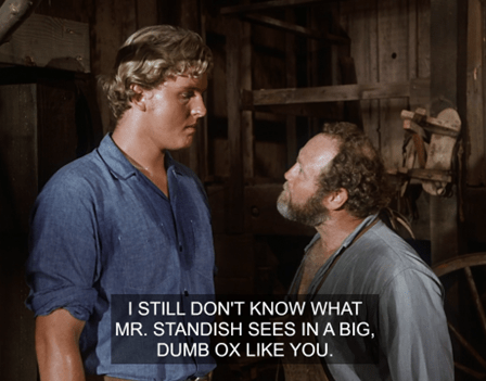 Pa frowns and says, “Well, I guarantee you Mr. Standish went to school.” (I’m not so sure about that. Al Swearengen didn’t.)