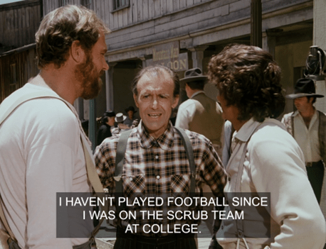 Big Dumb Luke threatens to stomp Albert’s head, and Garvey calls the Warriors over for a new strategy: Tom is simply going to hurl Albert to the other side of the field. I have no idea if this is really allowed or not. Again, football rules weren’t standardized at this time, so I’d say anything goes.