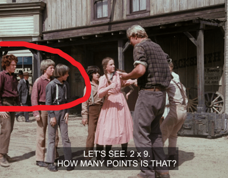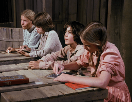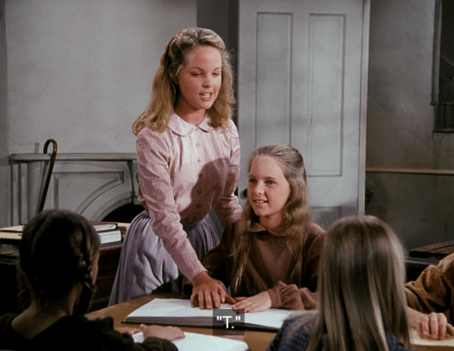 Sue is doing well, and when Mary says she deserves an A, Sue pulls her hand onto the page and says, “It’s right here, Miss Ingalls!”