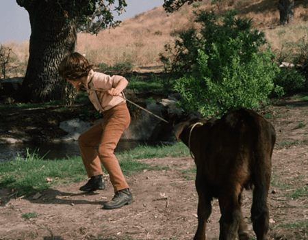 Charles comes down the driveway, and we see there’s a new cow in town – the Ingallses’ third so far in the series.