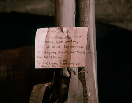 Unsentimentally saying goodbye to Fagin and Bandit (see, that’s the Albert I like), Albert tacks a note (addressed to “Mr. Ingalls”) to the cow stall and leaves.