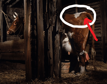 Interestingly, this cow’s markings are identical to those of Cow, their second cow, whom Charles sold, or slaughtered, or maybe abandoned to die, before the family departed for Winoka last season.
