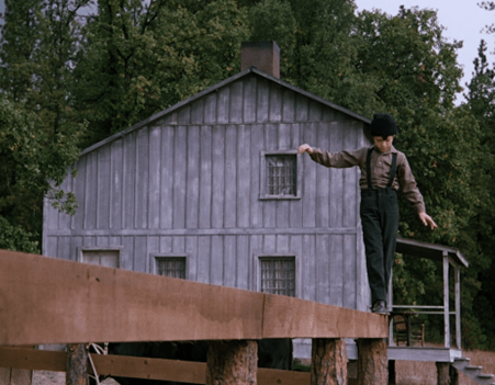 Jordan jumps up onto a fence and walks the length of it, to more circus music.