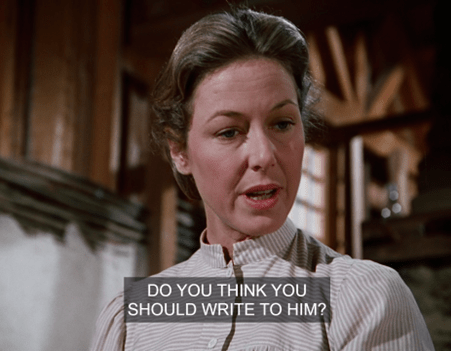 Doc says she’s about three months gone, and Mary and Ma twitter about how excited Adam and Pa will be. (Thank goodness we’re free to use twitter as a verb again.)