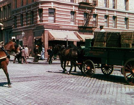 We transition then to the thoroughfare, where Hans Dorfler (!) is leading two Bunnies towards the livery as another man sits on the Post Office steps texting.