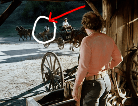 Behind him, a Medieval Peasant Woman and a man in a derby (Nels?) drive by in a (non-yellow-wheeled) buckboard.