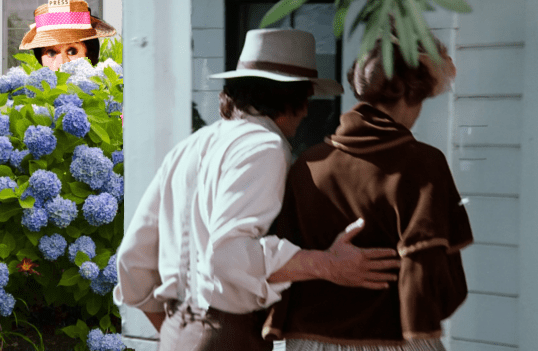 On the sidewalk we see a man who resembles a genteel upscale Toby Noe, tipping his had to a lady.