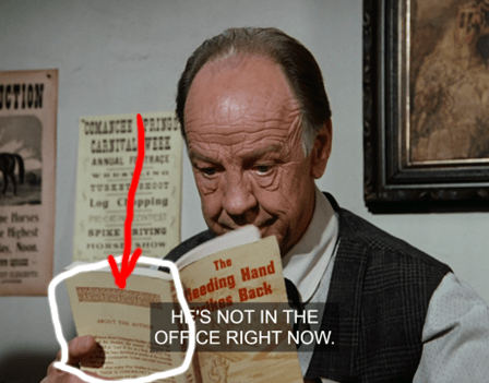 The clerk or whatever he is, who looks like W.H. Auden, is reading The Bleeding Hand Strikes Back, Laura’s favorite Farnsdale Fremont mystery.