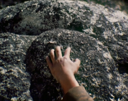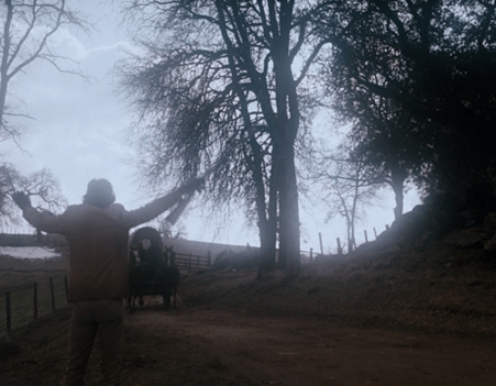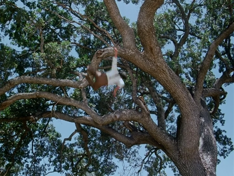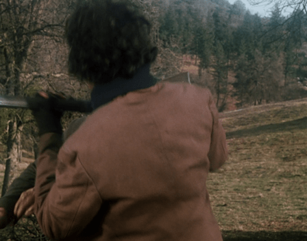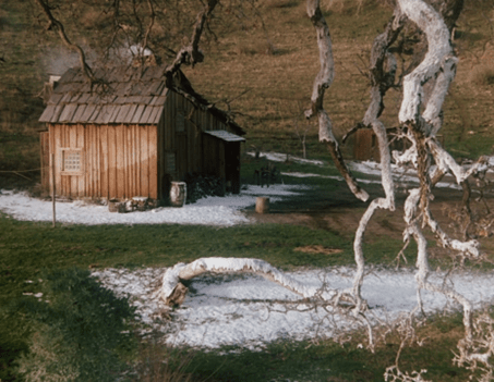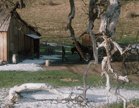 The camera pans down from some treetops (Charles-fallin’-out-of type) to show us some sheep and some snow.