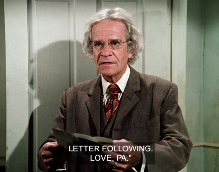 Alice Garvey is embroidering a hanky or the like by the fire, and Caroline sits in the “Terror of the Autons” chair.