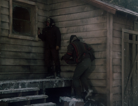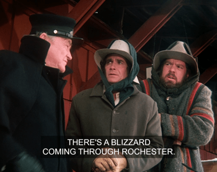 The men all run outside. “Thank God you’re here!” Doc cries emotionally as the “snow” blows around.