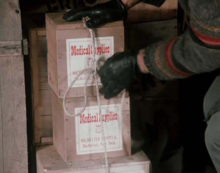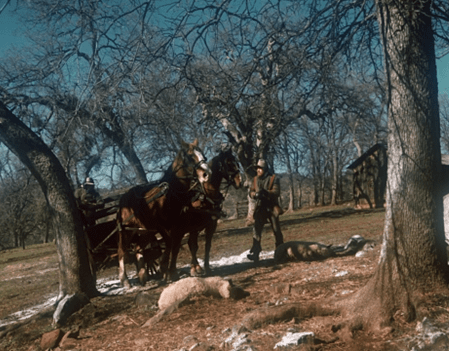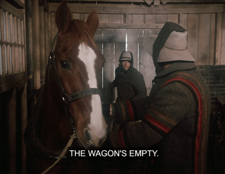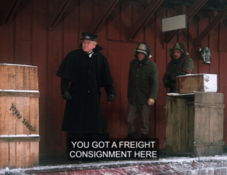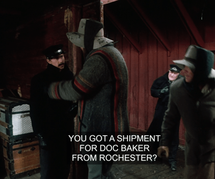 Then we see Charles and Jonathan Garvey, in winter garb, unloading lumber. A poster behind them advertises a company that looks like “Meow Stage Lines,” but that doesn’t help us identify their location.