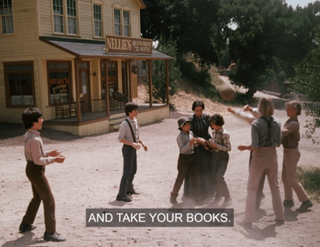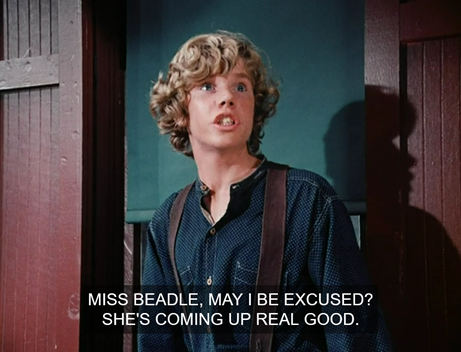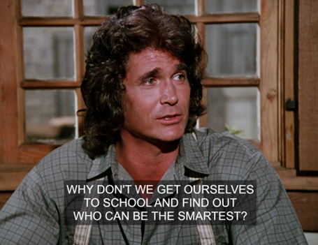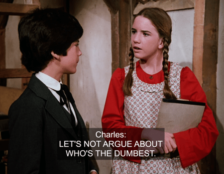 They start calling each other dumb, and Pa says cheesily, “All right, now let’s not argue about who’s the dumbest, why don’t we get ourselves to school and see who can be the smartest?”