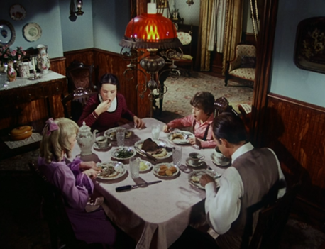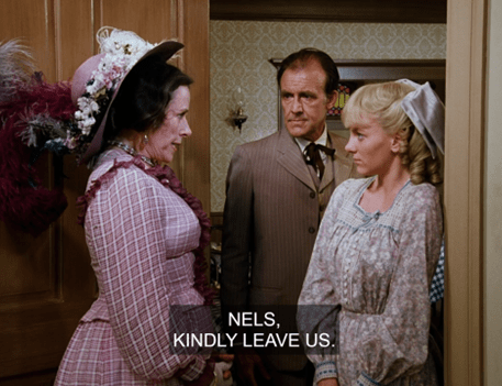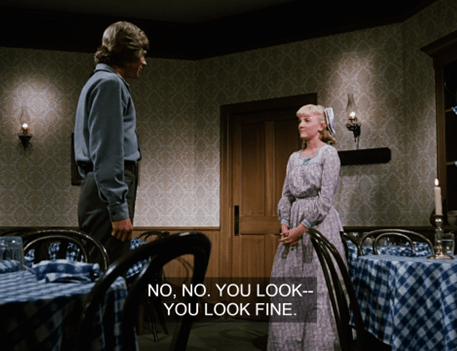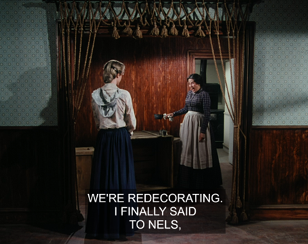 Out in the dining room, Nellie welcomes Almanzo and they have an awkward little conversation. (“You look fine.” “Do you really think so?” “Yes.”)