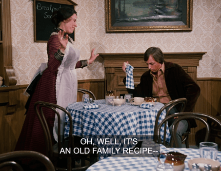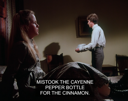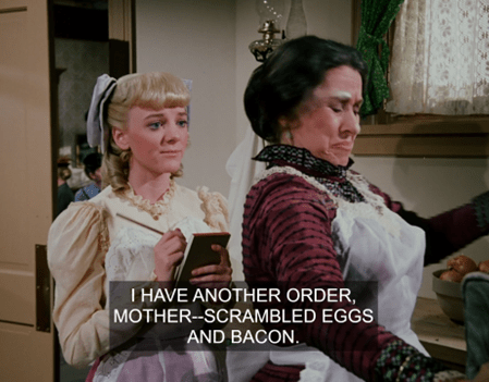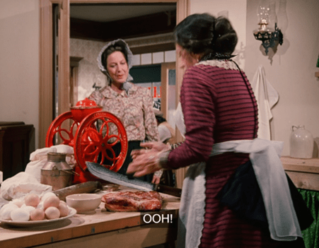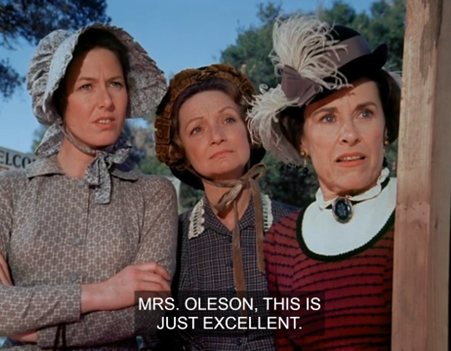 Delighted, Mrs. Oleson announces cinnamon chicken is Nellie’s “specialty.” We know that’s not true, but perhaps they sell an Eight Hundred Years of Moorish Cooking book in the Mercantile and she figures she can just pull a recipe from that.