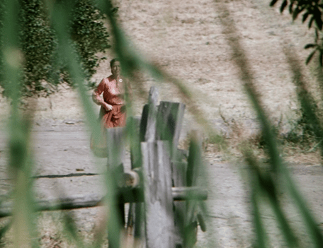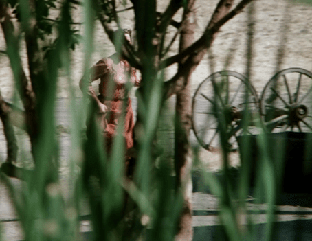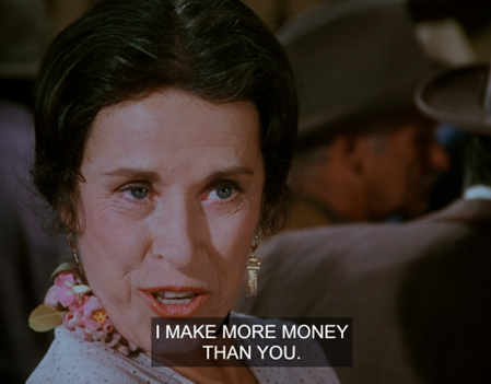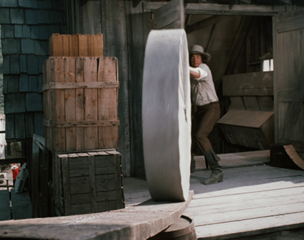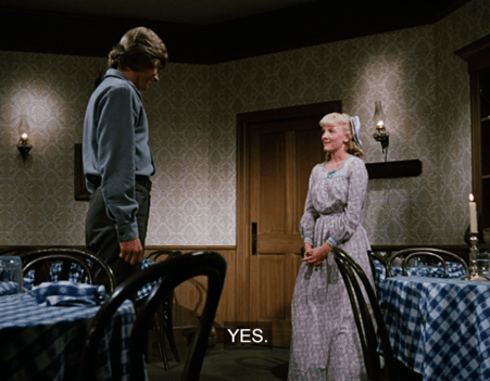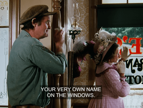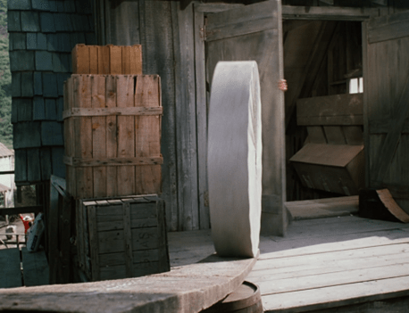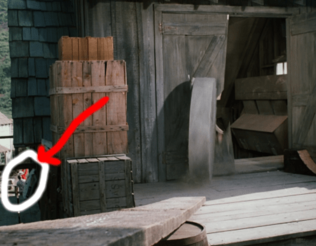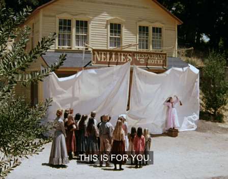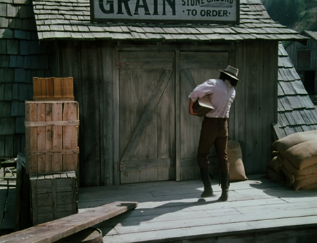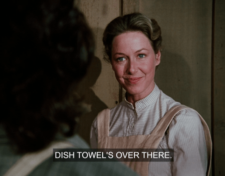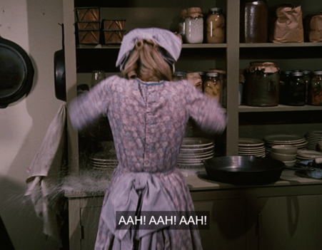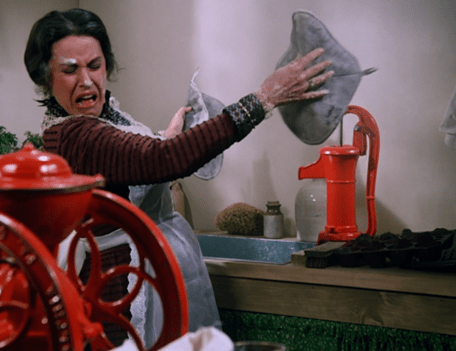 The perspective of the shot is surreal, making Mrs. Oleson for a moment look like she’s been miniaturized.