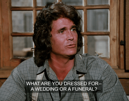 “What are you dressed for, a wedding or a funeral?” Pa says. (I like dressing nicely, and people at work ask me that too. It’s fucking annoying!)