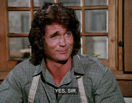 Pa’s hair today is large, a little limp, and freshly-dyed-looking. You know, I just read Dean Butler’s book, and in it he notes that Landon was superstitious about cutting his hair because of the story of Samson and Delilah.