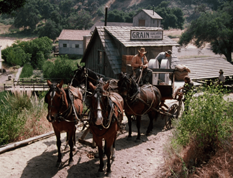 A wagon passes carrying a weird mixture of characters.