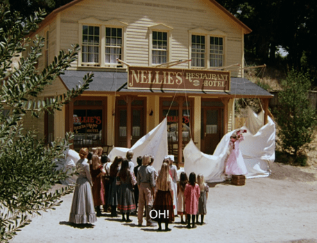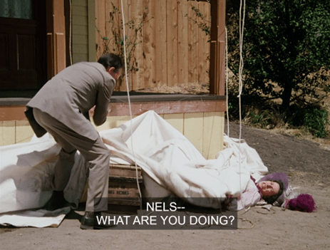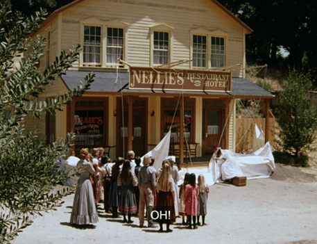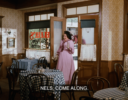 Nels starts to explain, but Mrs. Oleson suddenly shrieks at him from the Mercantile porch.