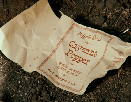 Laura goes to Ma’s spice cabinet and takes not the cinnamon, but the cayenne pepper, the label of which she discards in the driveway. (The brand is Hoffarth, which is not a real one.)