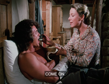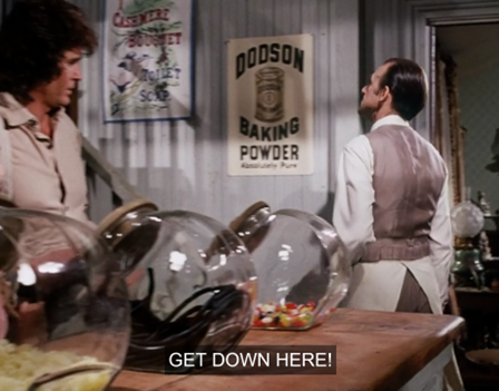 Well, I’ll start by saying it goes on for four minutes, an eternity in today’s TV time. It covers a) Albert dressing up for the teacher; b) Albert’s disappointment with Eliza Jane’s looks; c) the sheet falling on Mrs. Oleson; d) the restaurant walkthrough; e) “Who’s going to do the cooking?”; f) Laura meeting Manly; g) “Lord-a-mercy, what’s this thing weigh!” and the accident; h) stoned shirtless Charles; i) Doc telling Garvey Charles won’t be able to work the harvest season (yep, over-detailed); j) the “crisp pancakes!” scene; k) Ma abandoning Baby Grace in the dining room; l) Charles freaking out whilst being spoon-fed; m) the dinner invitation; n) “Mrs. Oleson, I do not work Sundays and that is final” and Laura volunteering; o) the cayenne switcheroo; p) Nellie and Almanzo vomiting together into the sink; q) “Oh, Zaldamo!”; r) the cake in the face; and s) Nellie’s tantrum. Not quite A to Z, but pretty close.