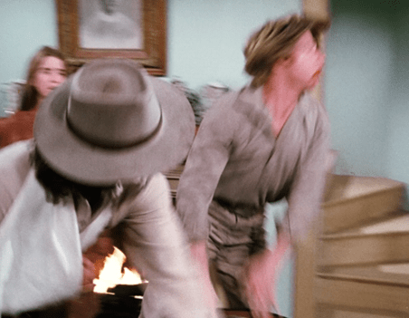 Almanzo goes tumbling through the room, knocking over the table with Michelangelo’s Moses on it.
