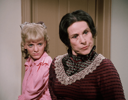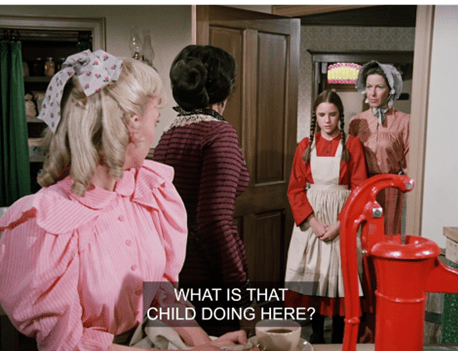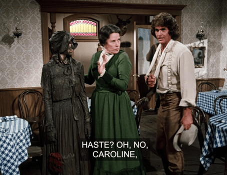 “Oh!” Mrs. Oleson cries as Caroline and Laura enter, then she says Bracknellianishly: “What is that child doing here!”