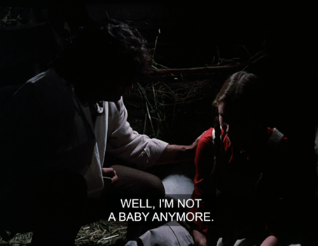 Pa goes out to the barn, and sternly accuses Laura of being “a little girl” hiding from punishment.