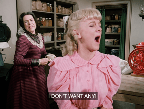 Mrs. Oleson tries to give Nellie some tea, but either Nellie is beginning to throw another tantrum, or the one she threw last night hasn’t ended yet.