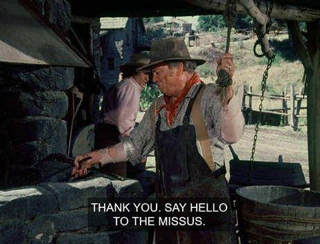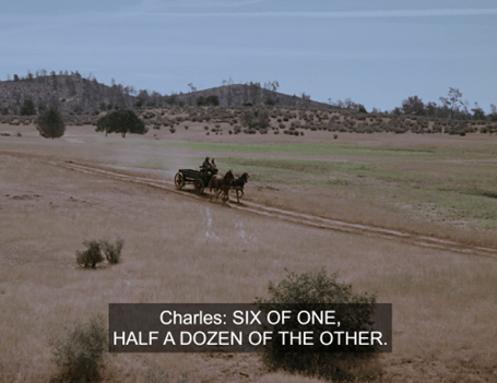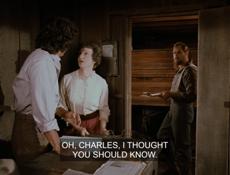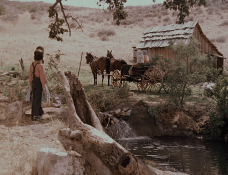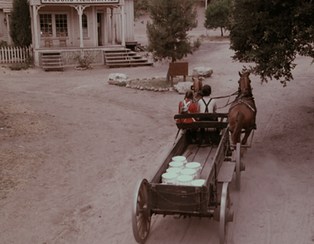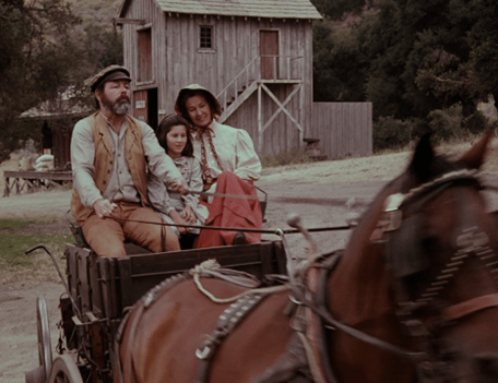 The ladies chit-chat a little, noting that Charles returns today from a Mankato work trip, and Ma takes off. (Others have observed Karen Grassle’s operation of the wagon’s parking brake here is incorrect. I’ll take their word for it.)