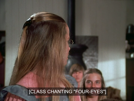 As the camera follows the disgruntled group out, we briefly see the Kid With Very Red Hair (Mean One) walking with an unknown girl who has hair of deepest auburn and is dressed all in greenish-whitish.