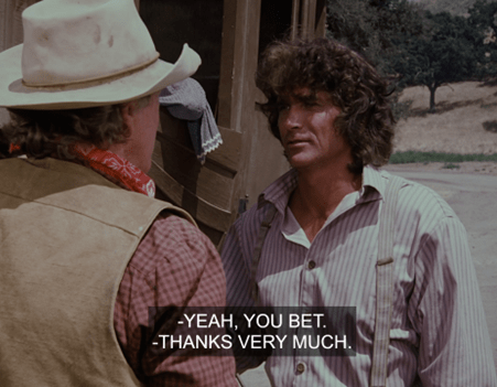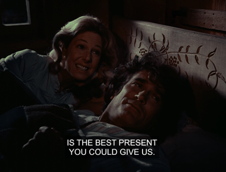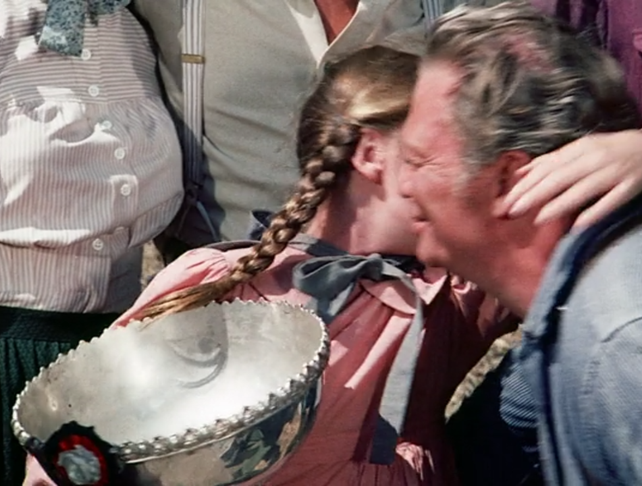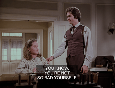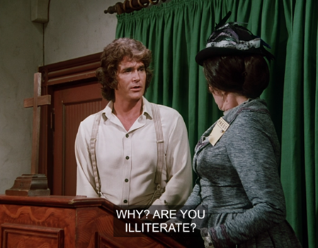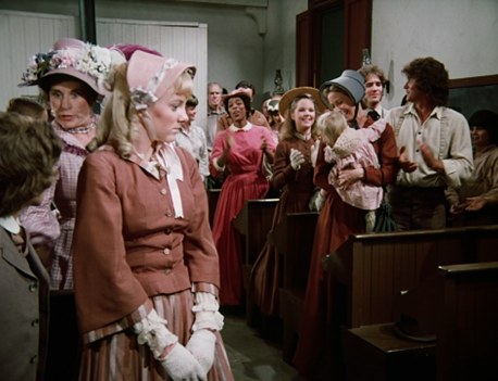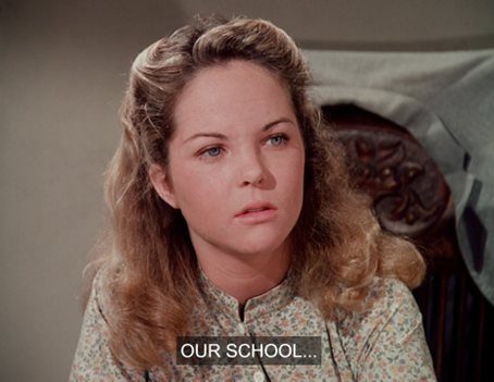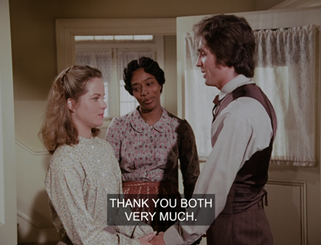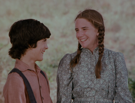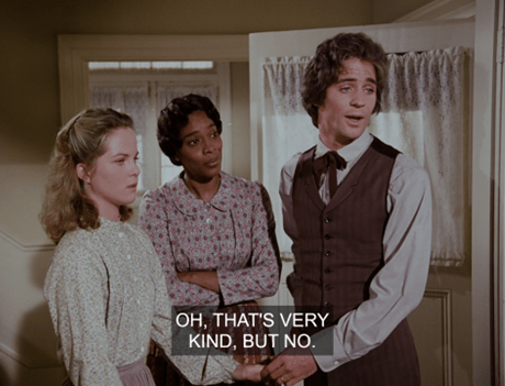 Rising, Mary says “Thank you, Teacher” rather sexily, and they start sucking face. Hoo hoo! This is a pretty spicy scene for Little House.