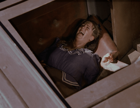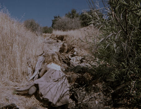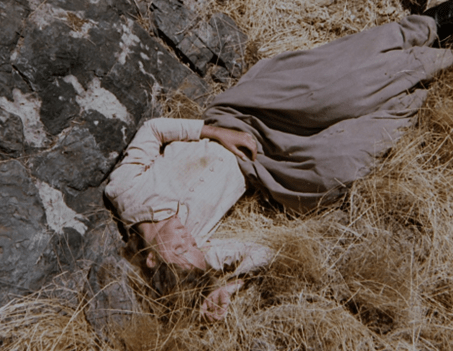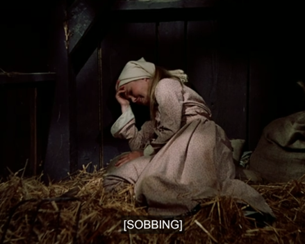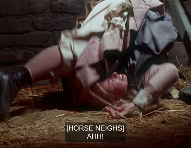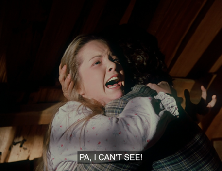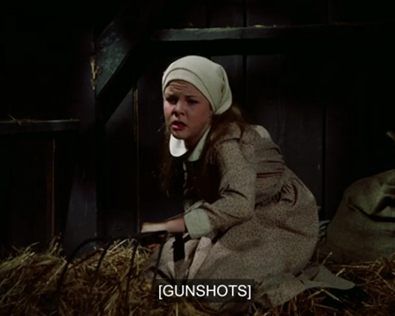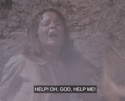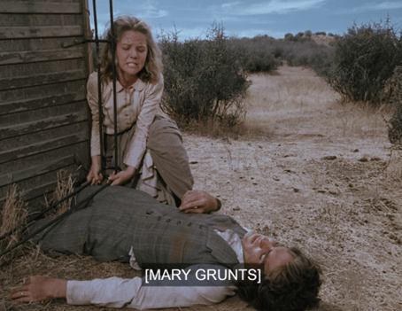 Pa comes running down the hill yelling. Mary gives a look of agonized relief at his voice (it’s quite satisfying), and screams, “Pa, help me!”